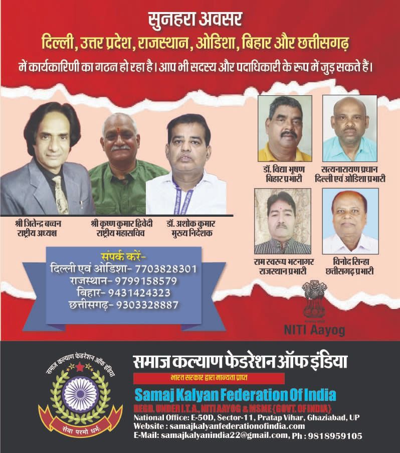 नई दिल्ली। समाज कल्याण फेडरेशन ऑफ इंडिया द्वारा राजधानी दिल्ली में 8वां राष्ट्र गौरव सम्मान समारोह का आयोजन रविवार, 15 फरवरी 2026 को किया जाएगा। समारोह में देशभर से विभिन्न क्षेत्रों में उत्कृष्ट कार्य करने वाली विभूतियों को सम्मानित किया जाएगा। राजस्थान प्रांत अध्यक्ष राम स्वरूप भटनागर ने जानकारी देते हुए बताया कि यह सम्मान उन व्यक्तियों के लिए है, जिन्होंने अपने-अपने क्षेत्र में उल्लेखनीय उपलब्धियाँ हासिल कर समाज और राष्ट्र के विकास में योगदान दिया है। उन्होंने बताया कि इस भव्य समारोह में समाजसेवी, चिकित्सक, पुलिस अधिकारी, शिक्षक, साहित्यकार, कलाकार, व्यवसायी, उद्यमी, पत्रकार, पर्यावरणविद्, रियल एस्टेट क्षेत्र से जुड़े लोग, इंजीनियर, फैशन एवं अन्य क्षेत्रों में उत्कृष्ट कार्य करने वाले व्यक्तियों को सम्मानित किया जाएगा। समारोह के दौरान कुल 41 चयनित प्रतिभाओं को राष्ट्र गौरव अवार्ड से नवाजा जाएगा। आयोजकों के अनुसार