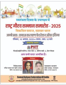जयपुर/पाली । राष्ट्रीय स्वेच्छिक ‘संगठन समाज कल्याण फेडेरशन ऑफ इंडिया’ देश की प्रतिभाओं को लगातार सम्मानित कर उनके भीतर सकारात्मक प्रेरणा जगाने का उत्कृष्ट प्रयास कर रहा है। इसी कड़ी में रविवार, 10 अगस्त को 7वां राष्ट्र गौरव सम्मान समारोह आयोजित किया जा रहा है, जिसमें 9 राज्यों की 70 हस्तियों को उनके संबंधित क्षेत्र में उत्कृष्ट कार्य के आधार पर सम्मानित किया जाएगा।