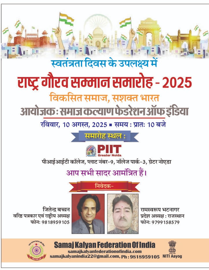 समाज कल्याण फेडरेशन ऑफ इंडिया द्वारा 10 अगस्त को देश के 9 राज्यों की 72 प्रतिभाओं को राष्ट्रीय स्तर पर विभिन्न क्षेत्रों में उत्कृष्ट कार्य करने पर पीआईआईटी कॉलेज नोएडा के एडिटोरियम हाल में सम्मानित किया जाएगा।