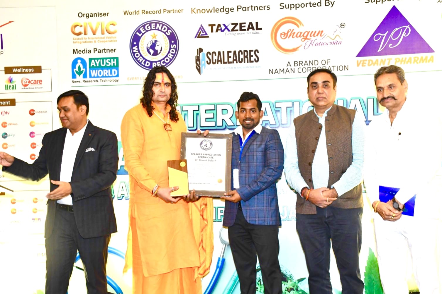 लिया जिसमें डॉ दिनेश बालाच को लीजेंड वर्ल्ड रिकॉर्ड होल्डर का सर्टिफिकेट एवं अवॉर्ड देकर सम्मानित किया गया।
