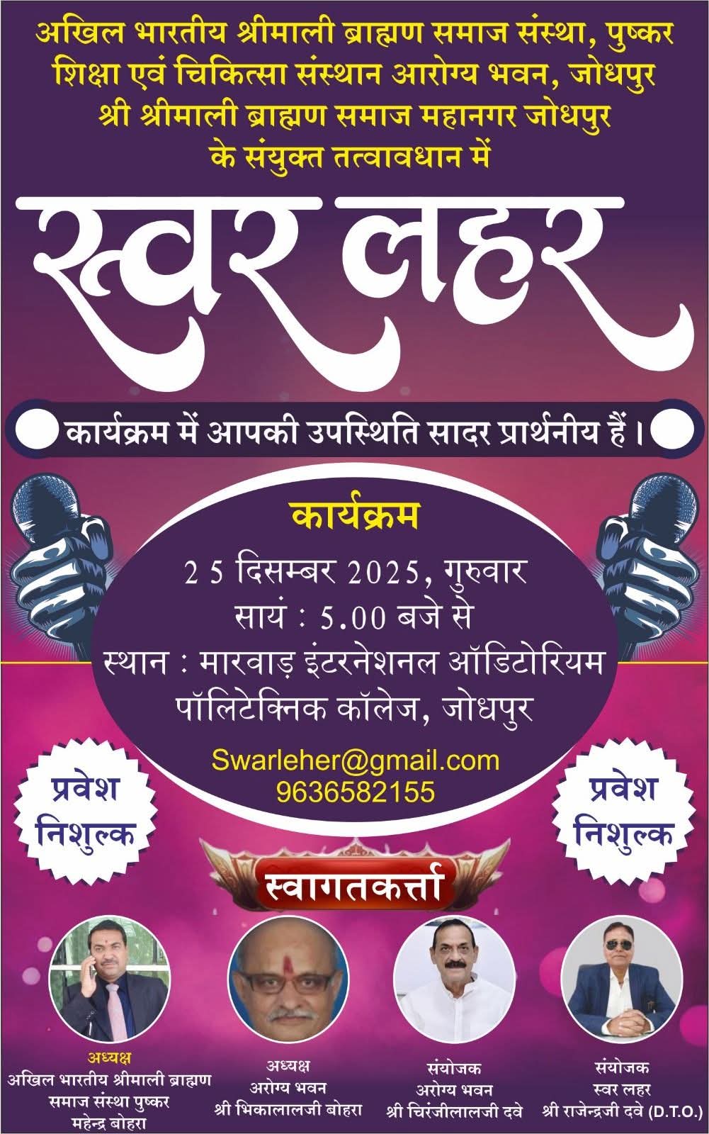 *श्रीमाली ब्राह्मण समाज का राष्ट्रीय सांस्कृतिक कार्यक्रम ‘स्वर लहर’ आज शाम*